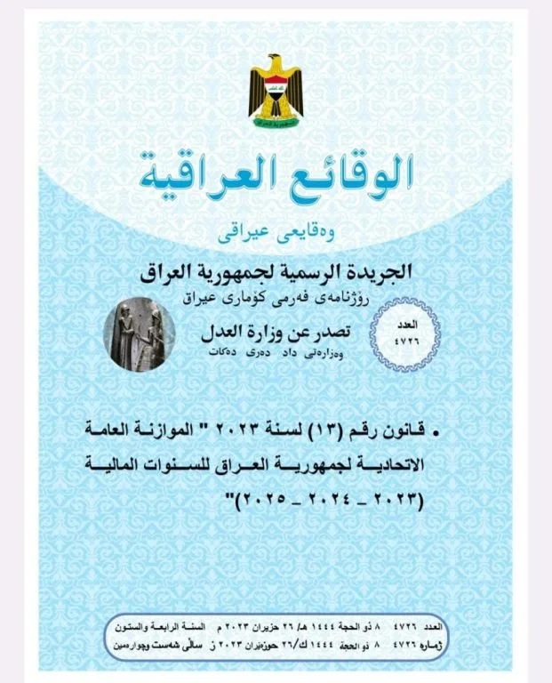 Iraq 11:05 – 2023-06-26 Today, Monday, the Iraqi Al-Waqa’i newspaper affiliated with the Ministry of Justice published Law No. (13) for the year 2023 “The Federal General Budget of the Republic of Iraq for the fiscal years (2023-2024-2025).” https://kirkuktv.net/AR/Details/16008